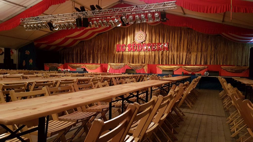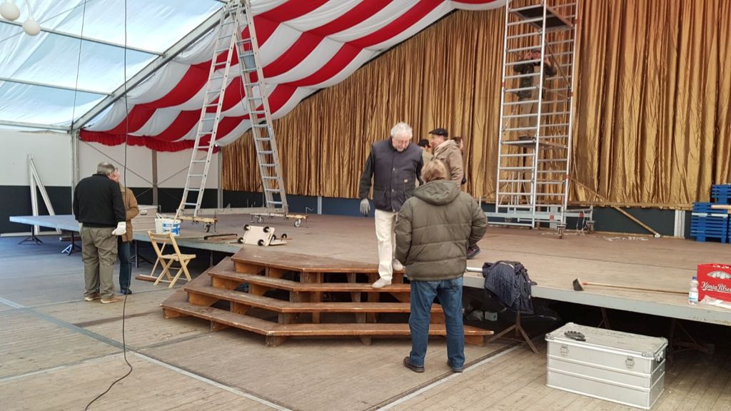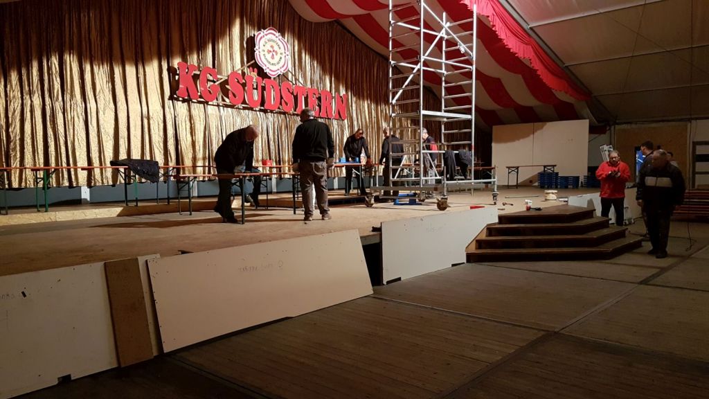 Da das Zelt für den „Altweiberball“ verkleinert wird werden nur wenige Tische aufgestellt. Für die Kindersitzung werden am Freitagmorgen Stuhlreihen, ähnlich wie im Kino oder Theater, zur besseren Sicht für unsere kleinen Gäste aufgebaut. Nach dem Ende der Kindersitzung muss das Zelt wieder für die Veranstaltung „Narrenkarussell“ , unter Mithilfe der Amazonen, hergerichtet werden. Dann können die „Weißjacken“ einige Tage ausgiebig feiern.